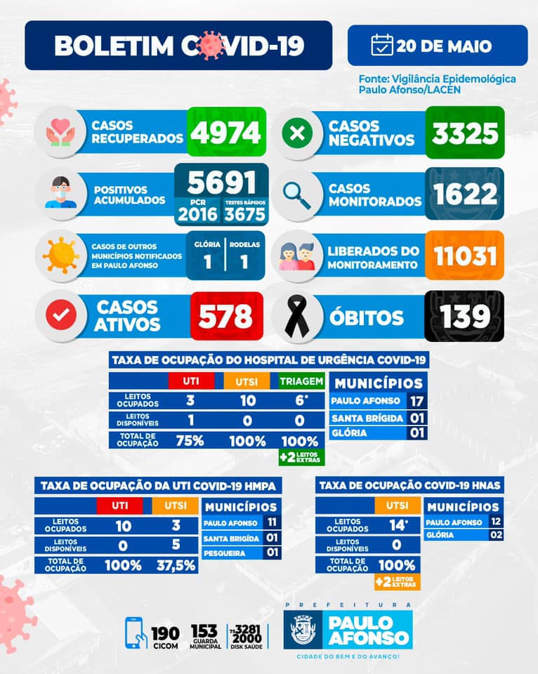 O leitos de UTI, UTSI e de triagem seguem lotados nas unidades de saúde de Paulo Afonso. Veja os números abaixo: