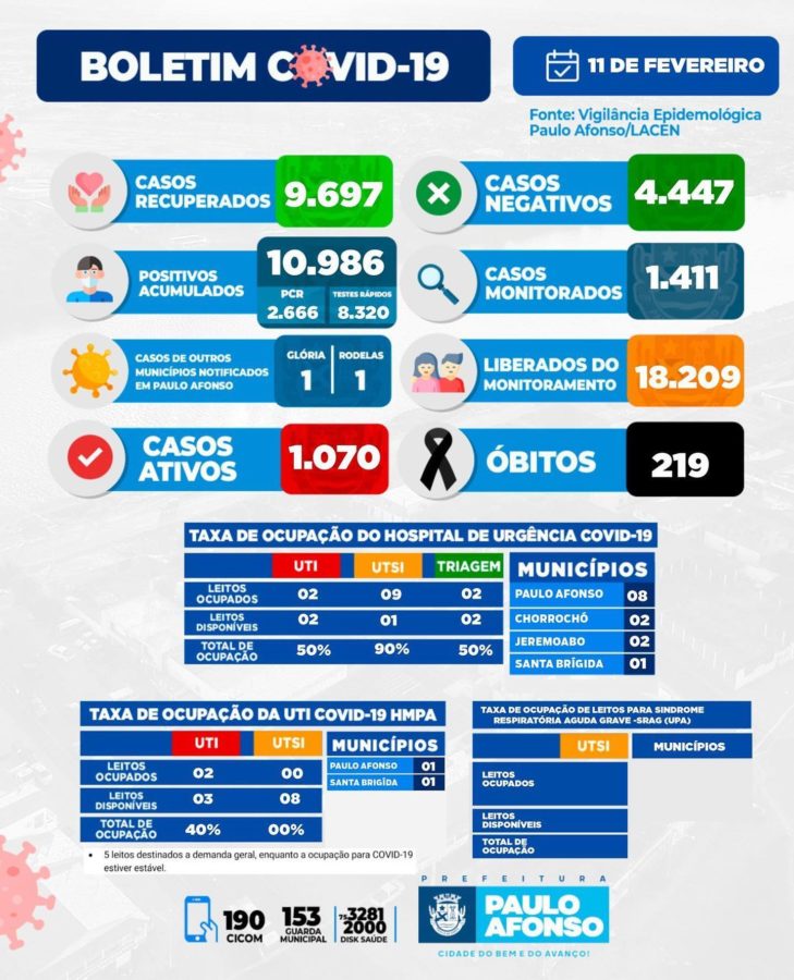 Nove pacientes de Paulo Afonso estão internados nas unidades de saúde do município com casos de covid. A ocupação nos leitos é de 40% na UTI do HMPA, e 50% na UTI UPA Covid. Os leitos semi-intensivos do Hospital de Urgência Covid (UPA) estão 90% preenchidos e na triagem, 50%. Nos semi-intensivos no HMPA não há internações.