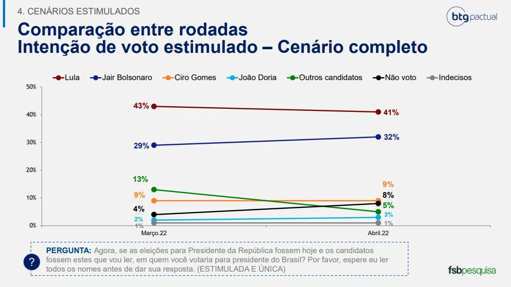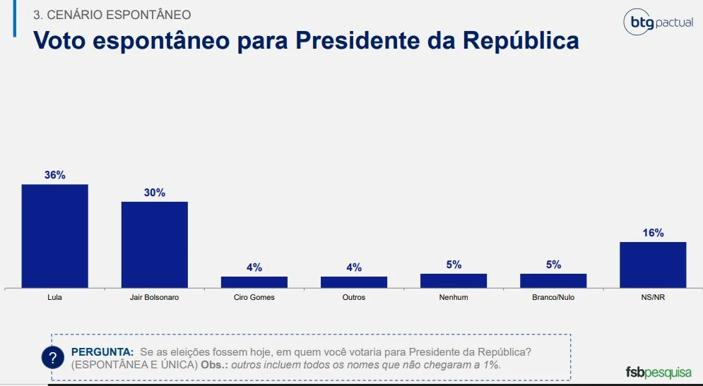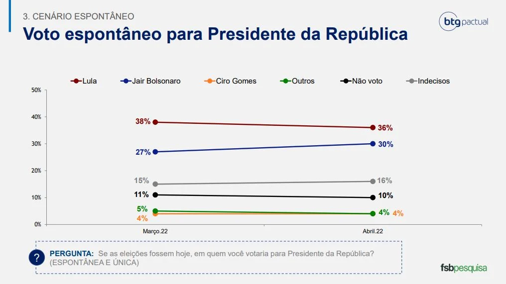 Pesquisa feita pelo Instituto FSB, a pedido do BTG Pactual, divulgada nesta segunda-feira (25/4), revelou que o presidente Jair Bolsonaro (PL) alcança 30% das intenções de votos espontâneos, enquanto o ex-presidente Luiz Inácio Lula da Silva (PT) marca 36%. Nessa versão, a diferença entre os dois candidatos caiu para seis pontos percentuais – no levantamento anterior, divulgado em março, era de 11 pontos percentuais.