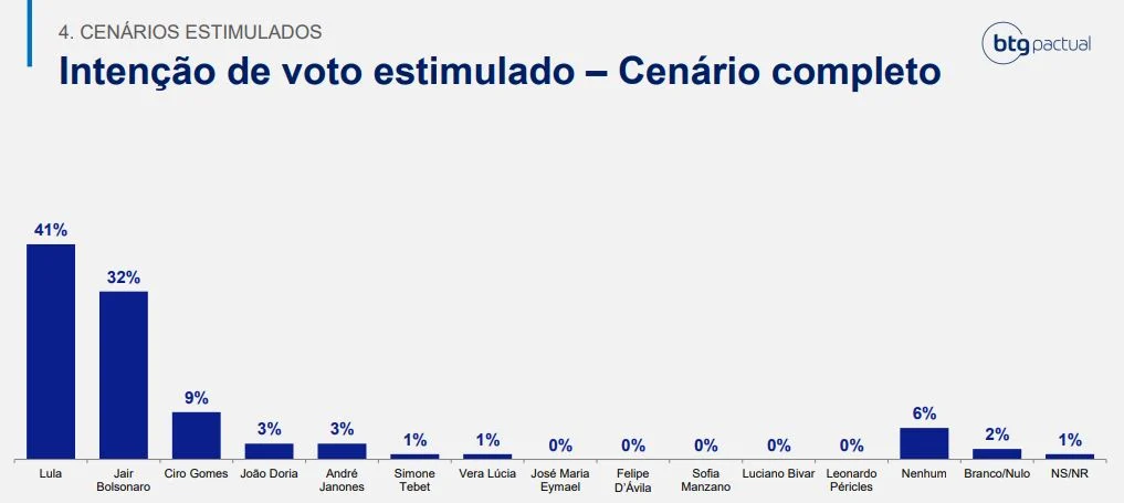 Luiz Inácio Lula da Silva também liderava as intenções de voto para o Palácio do Planalto, em um cenário estimulado, com 43%. Bolsonaro tinha 29%. Em seguida, apareciam Ciro Gomes (PDT), com 9%, e Sergio Moro (Podemos), com 8%.