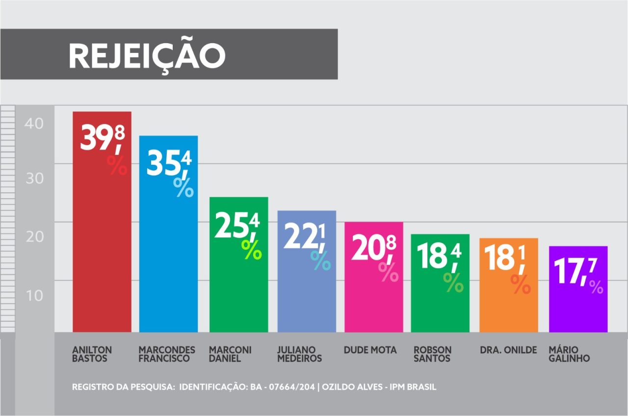 O levantamento da empresa IPM Brasil, sob a coordenação geral do sociólogo José Renato Melo, em parceria com o site PA4, do radialista Ozildo Alves, divulgado no início da semana, também revela quais nomes para disputar a prefeitura de Paulo Afonso têm mais rejeição entre os eleitores. A pesquisa incluiu o nome do ex-prefeito Anilton Bastos (MDB), que pode ser o candidato a vice do prefeito interino Marcondes Francisco (PP).
