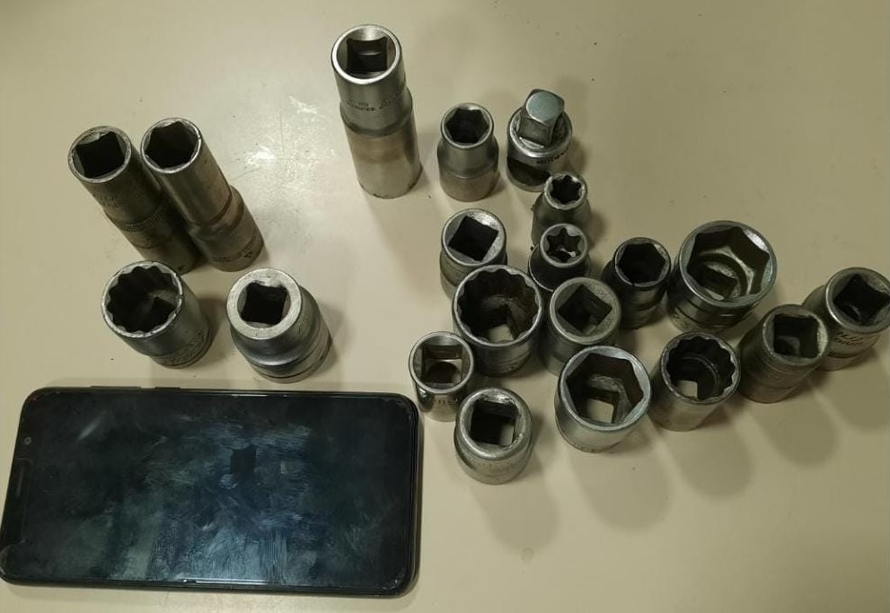 Ainda de acordo com o registro, também foi encontrada com o suspeito uma sacola com 20 (vinte) peças de chaves do tipo soquete. Em contato com o proprietário da referida loja, o mesmo confirmou o furto do celular e peças.