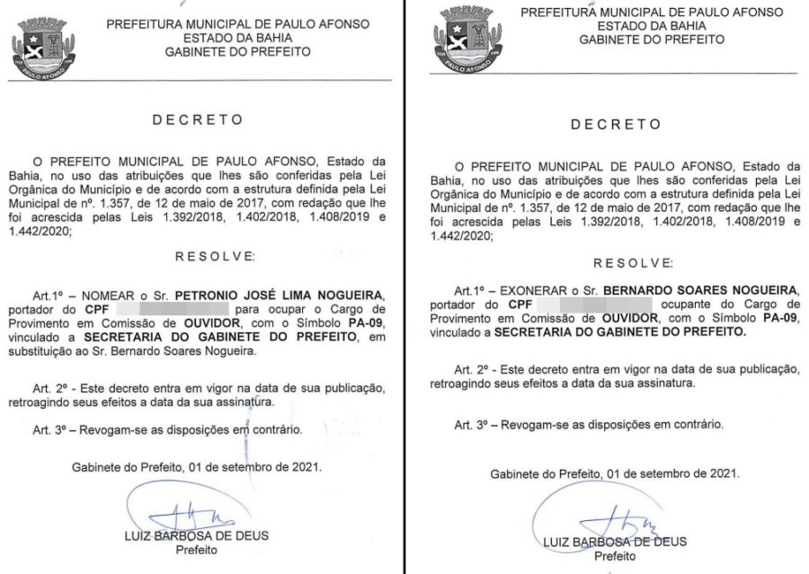 Petrônio assumirá o lugar que era do filho, Bernardo Soares Nogueira, que acabou exonerado do cargo. Não há informações sobre os motivos da mudança. De acordo com o portal transparência, o salário bruto do Ouvidor do Município é de R$ 5.000,00 (cinco mil reais).