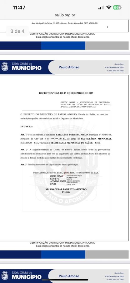 Em comunicado, a Prefeitura agradeceu os serviços prestados por Tarciane e ressaltou o compromisso da gestão em manter políticas públicas de saúde humanizadas, eficientes e acolhedoras para a população de Paulo Afonso.