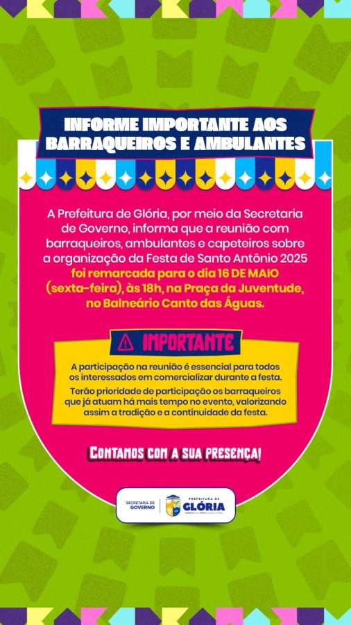 A Prefeitura de Glória, por meio da Secretaria de Governo, informa que a reunião com barraqueiros, ambulantes e capeteiros interessados em participar da organização da Festa de Santo Antônio 2025 foi remarcada para o dia 16 de maio (sexta-feira), às 18h, na Praça da Juventude, localizada no Balneário Canto das Águas.
