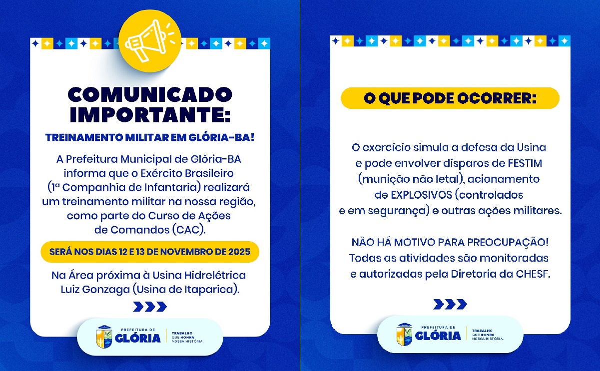 A Prefeitura Municipal de Glória informa que o Exército Brasileiro, por meio da 1ª Companhia de Infantaria, estará realizando um treinamento militar nos dias 12 e 13 de novembro de 2025, nas proximidades da Usina Hidrelétrica Luiz Gonzaga (Itaparica).