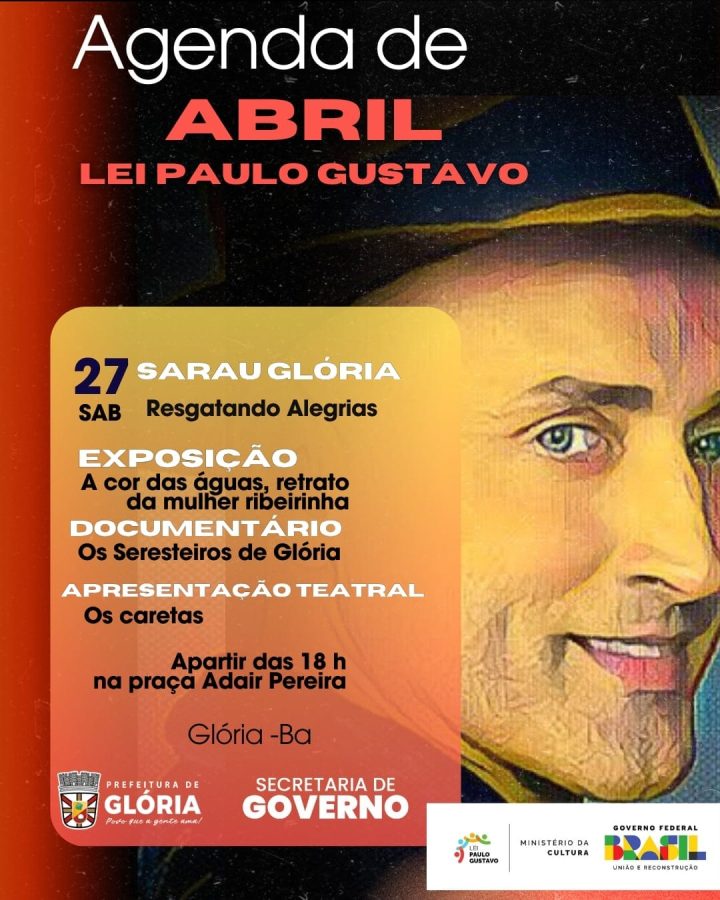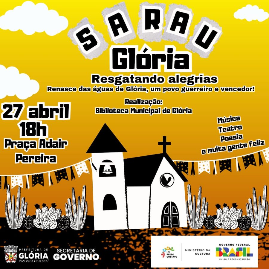 🌵Com o tema: “Renasce das água de Glória, um povo guerreiro e vencedor “, a Prefeitura de Glória, através da Secretaria de Governo e incentivo financeiro da Lei Paulo Gustavo, no dia 27 de abril, às 18h, na Praça Adair Pereira, será realizada a segunda edição do “SARAU RESGATANDO ALEGRIA”.