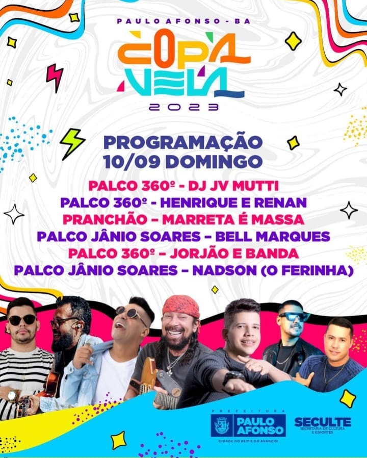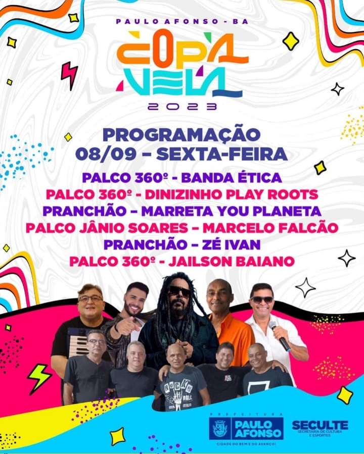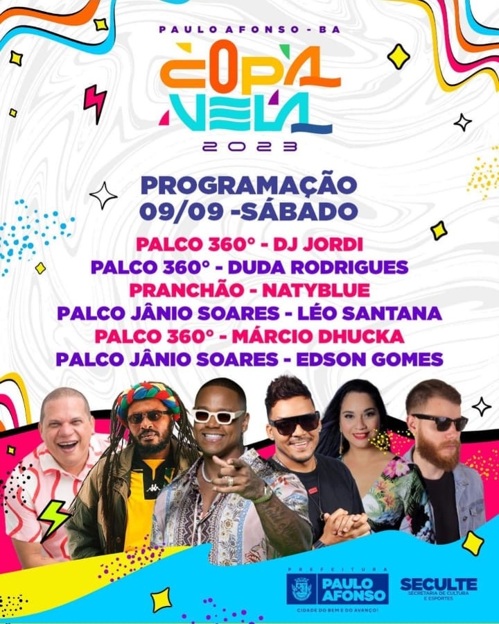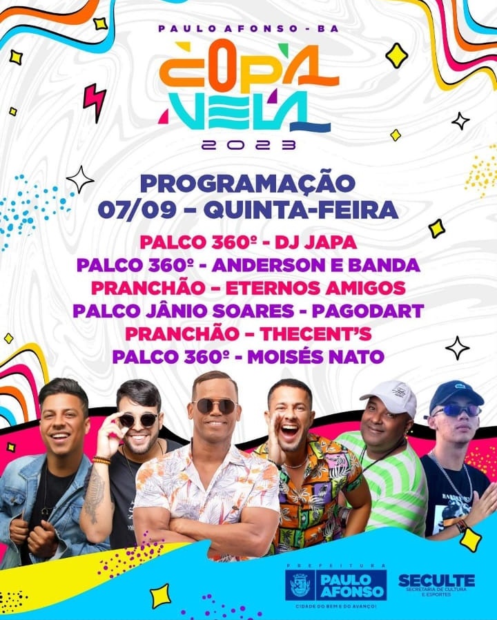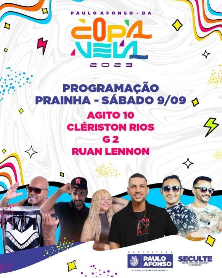 A Prefeitura de Paulo Afonso divulgou nesta quarta-feira, 30 de agosto, a programação completa da Copa Vela 2023, que será realizada de 7 a 10 de setembro. Os artistas locais e nacionais se apresentarão no palco principal, palco 360, trio e na Prainha! 🎶😍👏👏