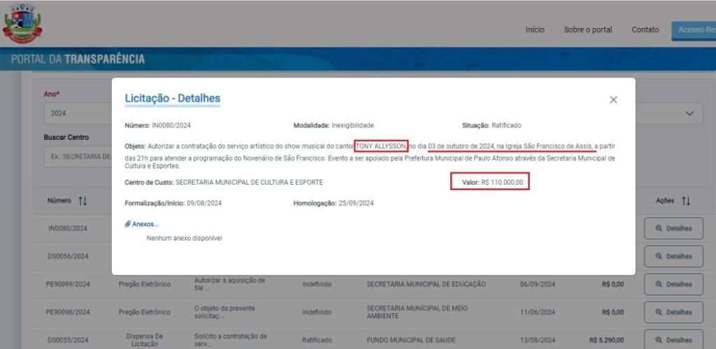 A Prefeitura de Paulo Afonso homologou a contratação do cantor Tony Allysson para um show na Novena de São Francisco de Assis, no dia 03 de outubro de 2024, às 21h, na Igreja São Francisco de Assis. O valor acordado para a apresentação foi de R$ 110 mil, conforme licitação publicada no Portal da Transparência.