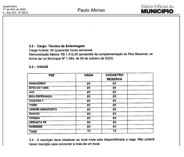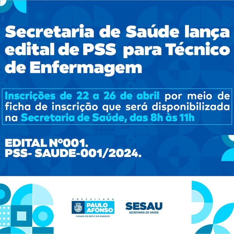 A Prefeitura de Paulo Afonso através da Secretaria de Saúde publicou nessa quarta-feira (17), o edital do Processo Seletivo Simplificado Simplificado para vagas e formação de cadastro reserva para Nível Médio de Técnico de Enfermagem, com lotação específica para os Postos de Saúde da Família, localizados na Zona Rural.