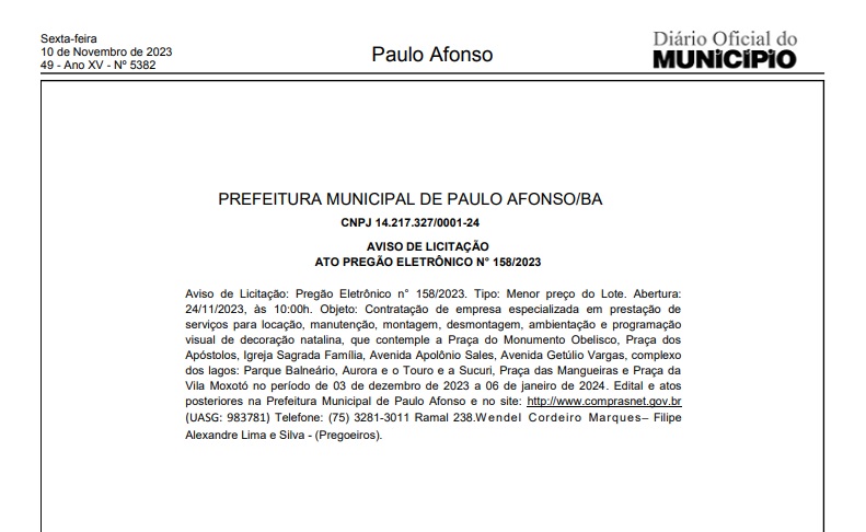 Três dias após o “vamos aguardar”, do secretário de Cultura e Esporte, Dernival Oliveira, a Prefeitura de Paulo Afonso publicou nesta sexta-feira (10/11) no Diário Oficial do Município, edital de licitação, tipo pregão eletrônico, referente a contratação de empresa especializada, que ficará responsável pela decoração natalina 2023 em oito pontos da cidade.