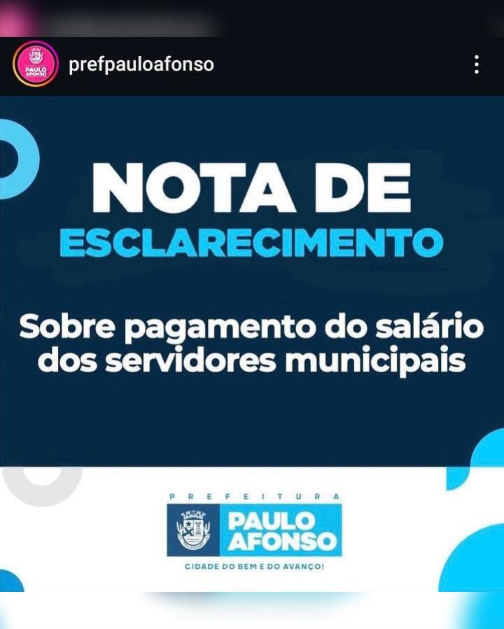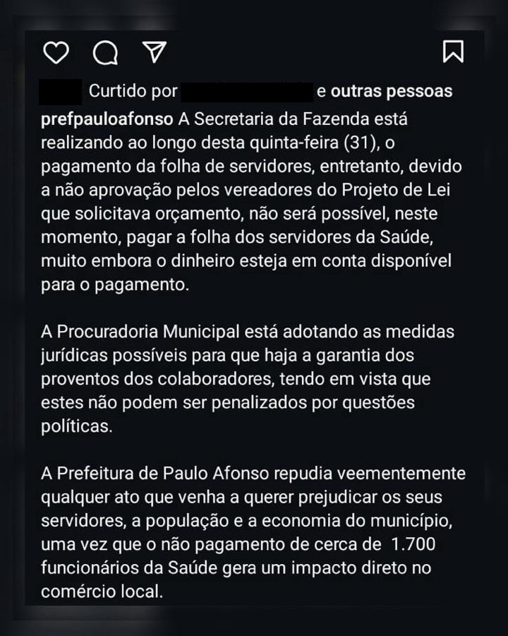 Nesta quinta-feira (31), a Prefeitura de Paulo Afonso informou que, embora o pagamento da folha dos servidores municipais esteja em andamento, os profissionais da Saúde não receberão seus salários no momento. Segundo a administração municipal, a causa é a reprovação de um Projeto de Lei que solicitava o remanejamento de recursos para cobrir a folha da Saúde. A Prefeitura afirmou que o valor já está disponível em conta, mas que o repasse não foi autorizado devido à decisão dos vereadores.