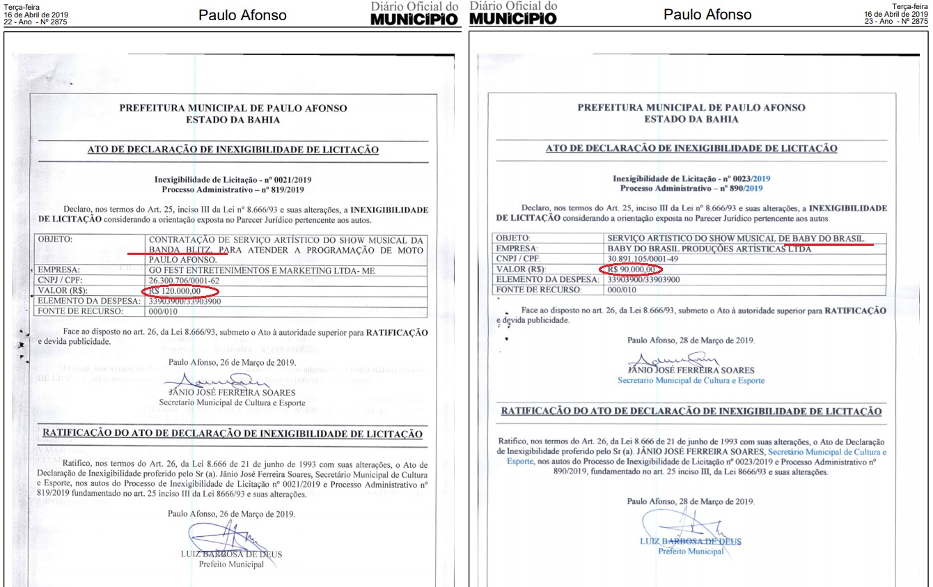 De acordo com os documentos publicados, as duas atrações musicais foram contratadas pela prefeitura, “por meio de inexigibilidade de licitações, sendo fundamentadas na orientação do Parecer Jurídico pertencente aos autos.”