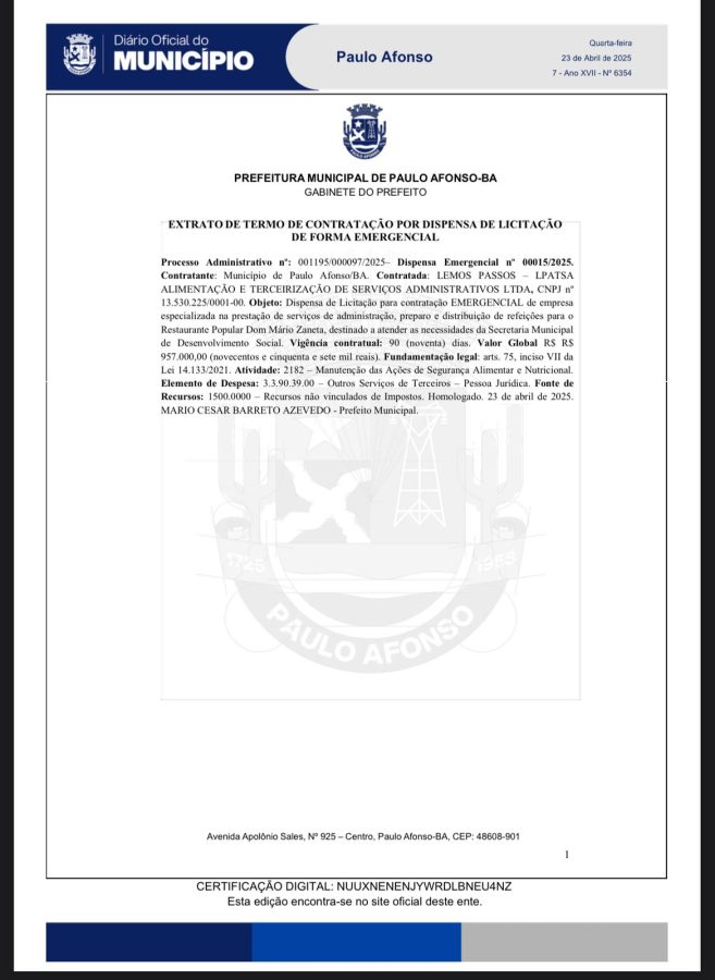 A Prefeitura de Paulo Afonso homologou nesta quarta-feira, 23 de abril, contrato emergencial com a empresa Lemos Passos – LPATSA Alimentação e Terceirização de Serviços Administrativos LTDA para reabertura do Restaurante Popular Dom Mário Zanetta. A informação consta em publicação no Diário Oficial do Município.