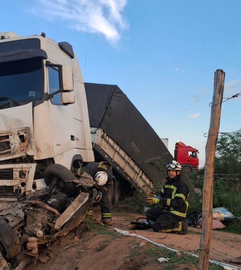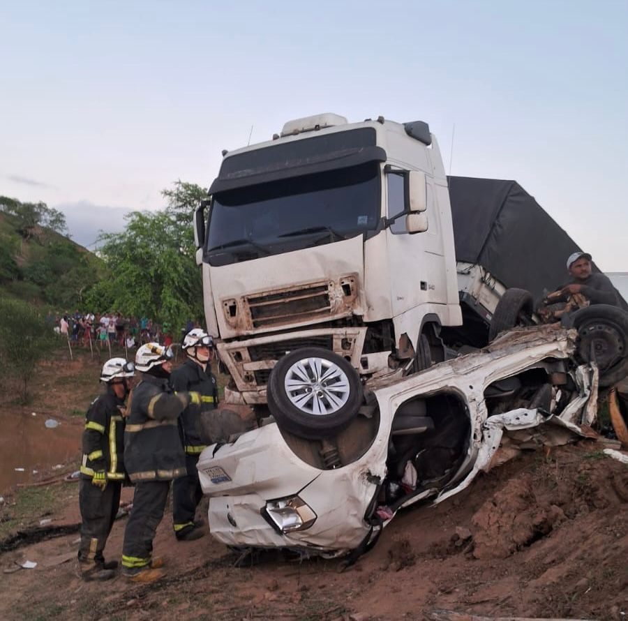 O acidente ocorreu na tarde de quarta-feira (29), no km 122 da rodovia, envolvendo uma carreta bitrem e dois veículos menores. Segundo a PRF de Santo Amaro, um dos carros tentou uma ultrapassagem arriscada e colidiu frontalmente com o caminhão. O impacto fez o caminhoneiro perder o controle e atingir o segundo carro, que foi arrastado e ficou preso sob a cabine do veículo de carga.