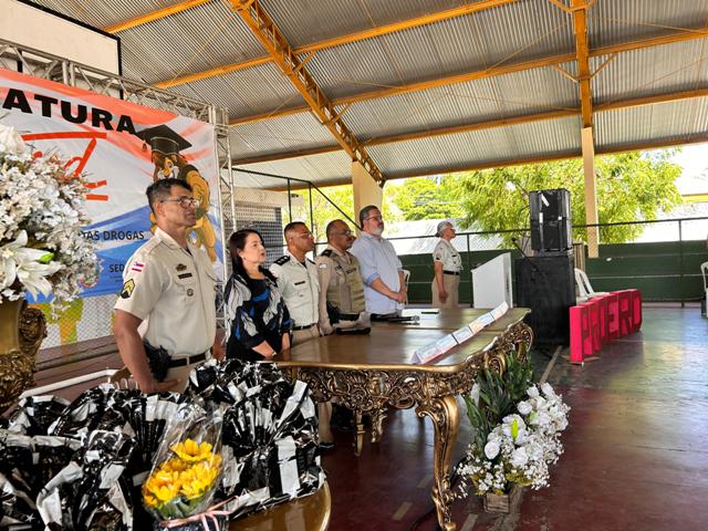 A solenidade contou ainda com a presença da Superintendente de Planejamento e Acompanhamento Pedagógico, Maria Ângela; do Sargento PM e instrutor Proerd, Adailton Soares; do Capitão PM e coordenador setorial do Proerd, Charles Eugênio; do Tenente-Coronel PM e comandante do 20º BPM, Marcos Davi; e do representante do Conselho Municipal de Educação, Humberto Alves.