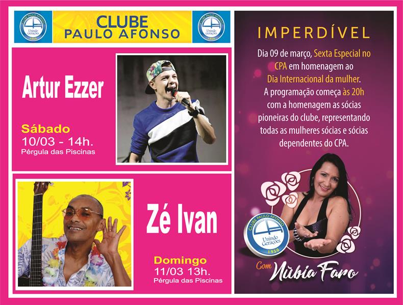 Programação do CPA tem Núbia Faro na sexta (9), Artur Ezzer no sábado (10) e Zé Ivan no domingo