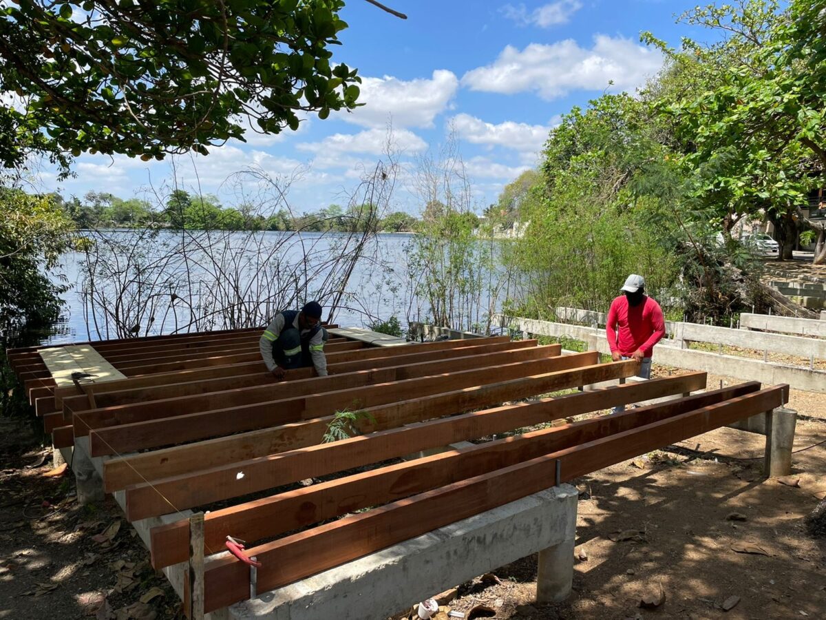 A obra inclui a construção de uma praça de contemplação do lago, com pergolado em madeira, estacionamento, área para crianças, caminho sinuoso em deck de madeira, mirante com área para descanso e cobertura vegetal, recuperação e replantio de vegetação local.