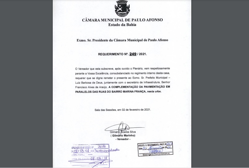 É importante lembrar que se trata de um requerimento de autoria do Vereador Gilmário, aprovado pela Câmara de Vereadores e atendido pelo Município.