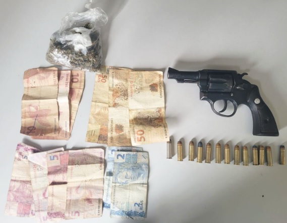 Durante a abordagem, um indivíduo que correspondia à descrição fornecida foi identificado e revistado. Com ele, os policiais encontraram uma porção de maconha, sete munições de revólver calibre .38 e R$ 204,00 em dinheiro. Questionado sobre a presença de mais ilícitos, o suspeito indicou a existência de um revólver em sua residência. A busca resultou na confirmação da presença de um revólver calibre .38 com numeração raspada e seis munições intactas.