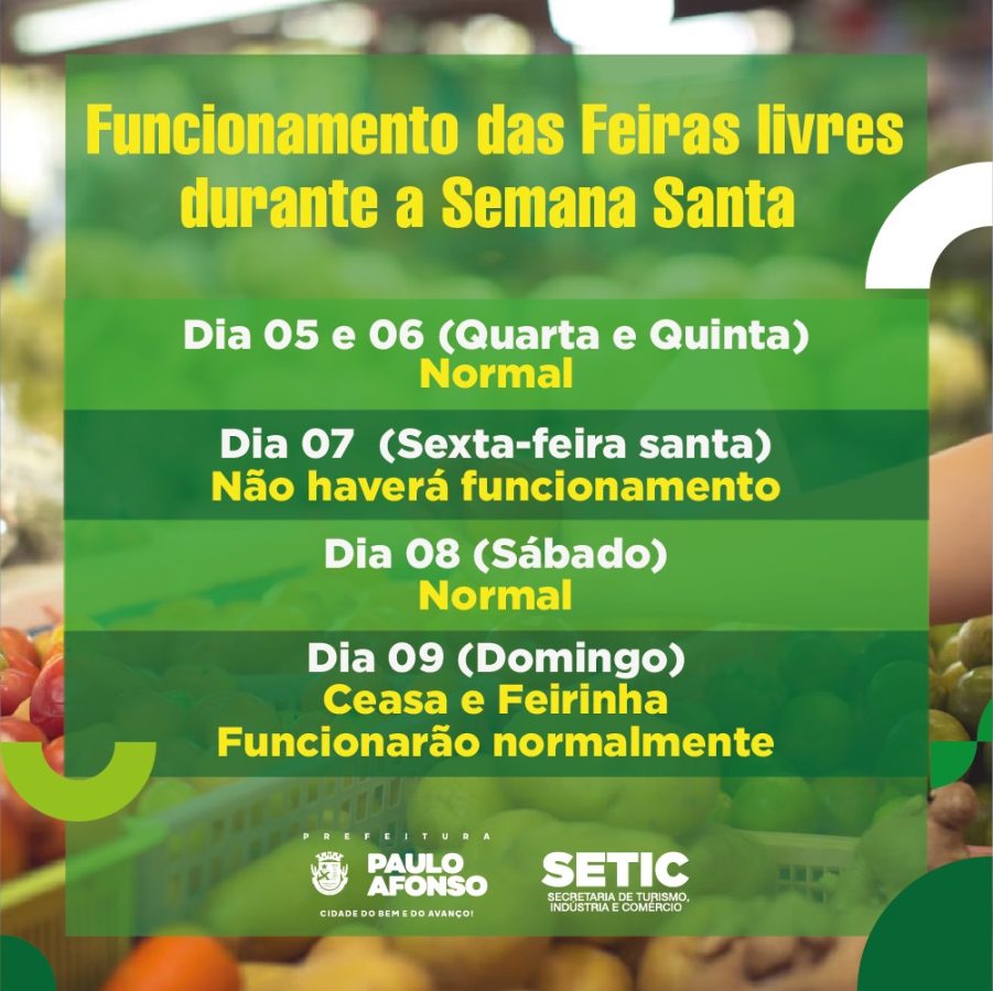 A Secretaria de Turismo, Indústria e Comércio (Setic) comunica à população o horário de funcionamento das feiras durante a Semana Santa, em abril.