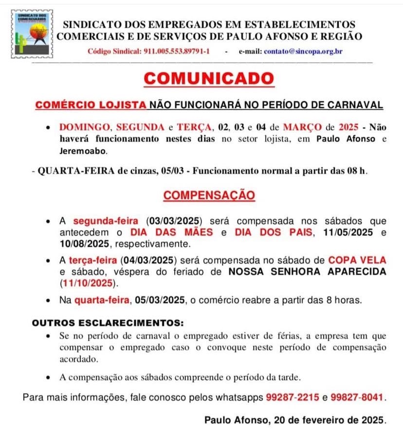 Durante o período de Carnaval, a cidade de Paulo Afonso adotará horários especiais no funcionamento do comércio (lojas e supermercados) e bancos. A seguir, confira os detalhes:
