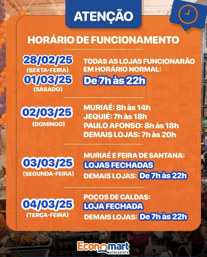 • Lojas: Estarão fechadas na segunda-feira (03/03) e terça-feira (04/03), retomando o funcionamento normal na quarta-feira (05/03), a partir das 8h.