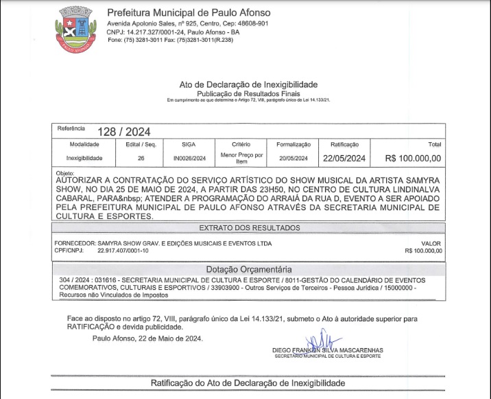 A Prefeitura de Paulo Afonso divulgou no Diário Oficial do município o valor do cachê da cantora Samyra Show para sua apresentação no “Arraiá da Rua D”, que acontece neste sábado, dia 25 de maio. A artista receberá R$ 100 mil pela performance.