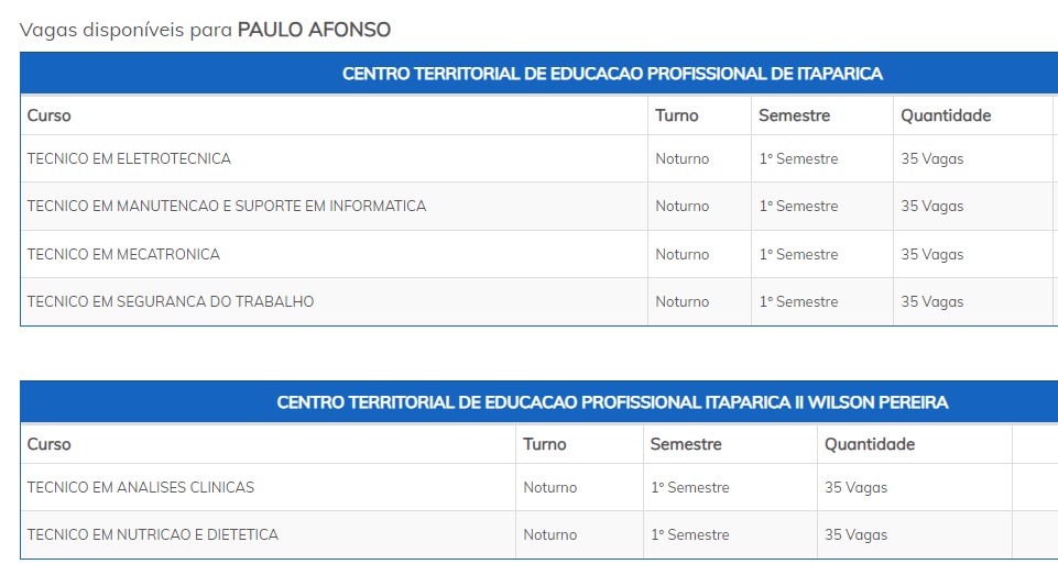 São 385 vagas em Paulo Afonso distribuídas nos Colégios Cetep 1 (antigo Ciepa), Cetepi 2 (antigo Wilson Pereira), Carlina Barbosa de Deus e Luís Eduardo Magalhães.