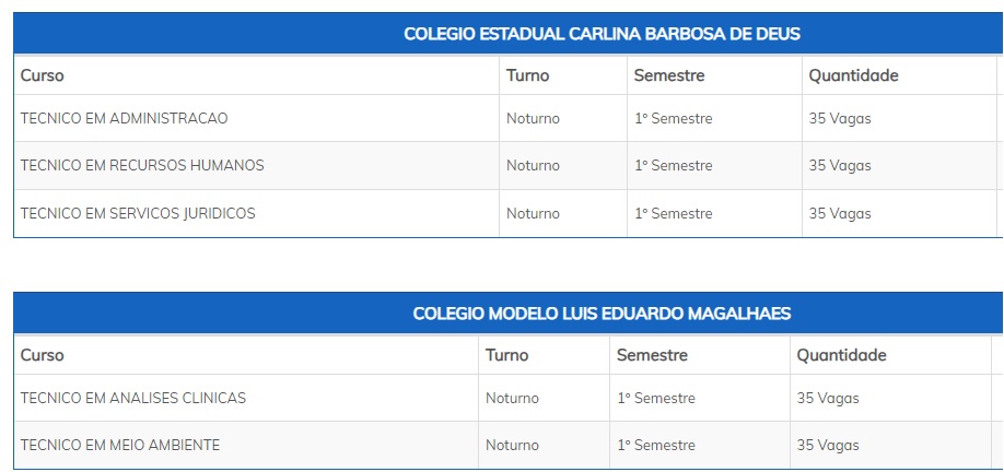 Este ano, o processo conta com um total de 13.510 vagas disponíveis para 40 cursos, totalmente gratuitos, que contemplam áreas como Administração, Agropecuária, Análises Clínicas, Enfermagem, Informática, Nutrição, Meio Ambiente, Segurança, Edificações, Produção Cultural e muito mais. Os cursos serão distribuídos em 26 Territórios de Identidade, disponibilizados na capital baiana e em 96 municípios, abrangendo 132 unidades escolares.