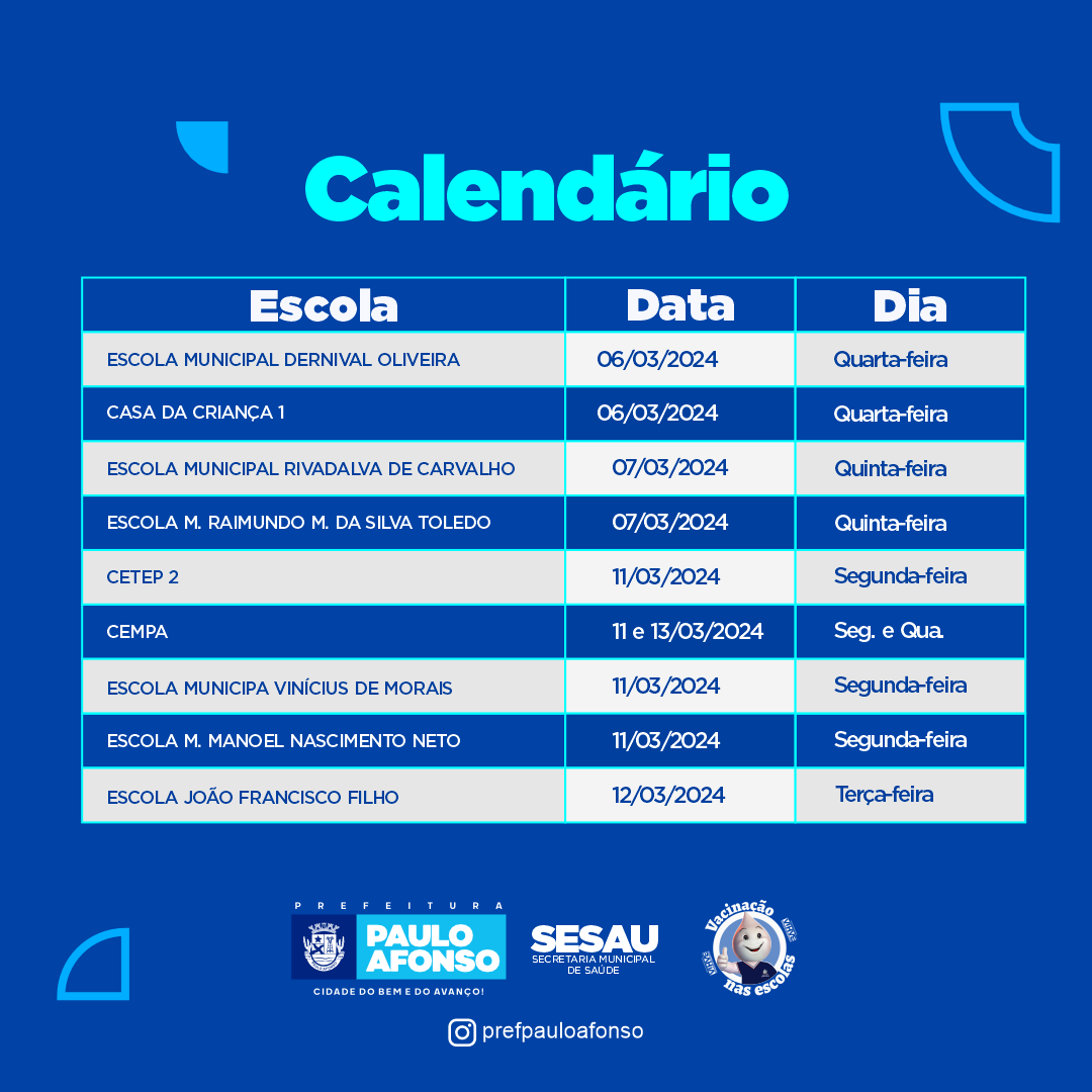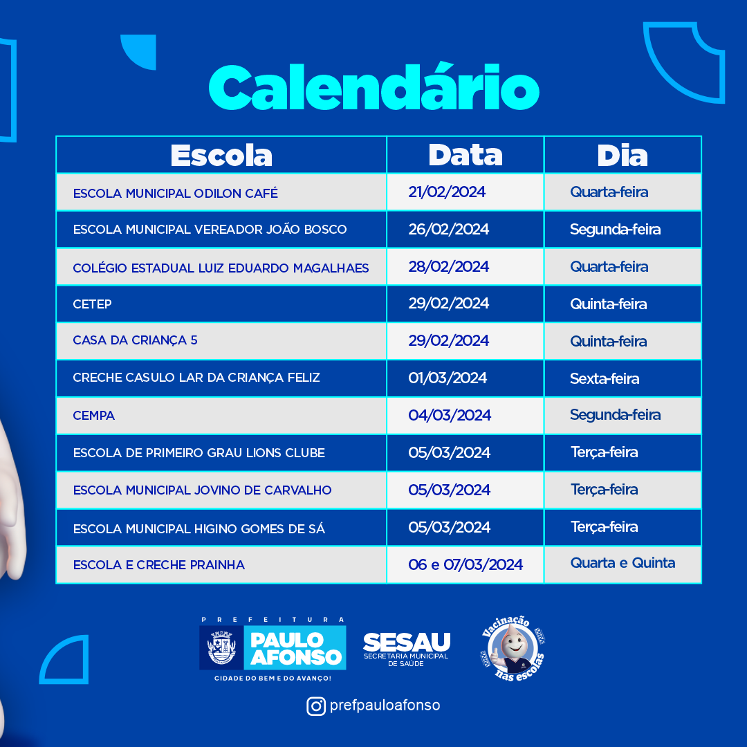 Com o objetivo de atualizar o calendário vacinal de crianças e adolescentes, de 1 ano a menores de 18 anos, a Secretaria Municipal de Saúde (Sesau) divulgou o calendário da Campanha de Vacinação nas escolas.
