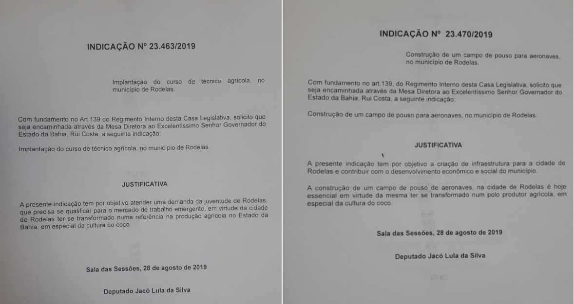 A primeira delas solicita a instalação de Curso Técnico Agrícola para atender uma demanda da juventude de Rodelas e região que precisa se qualificar para o mercado de trabalho emergente, em virtude da cidade ter se transformado numa referência na produção agrícola em especial a cultura do coco.