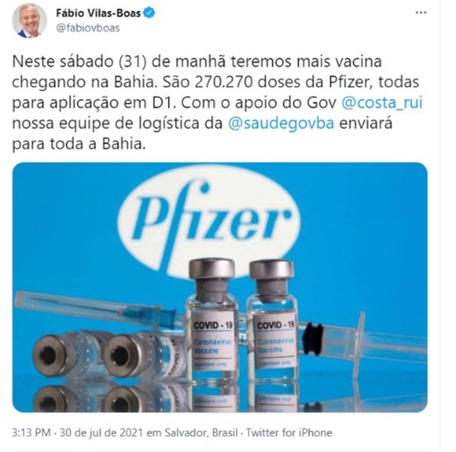 “Neste sábado (31) de manhã teremos mais vacina chegando na Bahia. São 270.270 doses da Pfizer, todas para aplicação em D1. Com o apoio do Gov @costa_rui nossa equipe de logística da @saudegovba enviará para toda a Bahia”, disse Fábio Vilas-Boas.