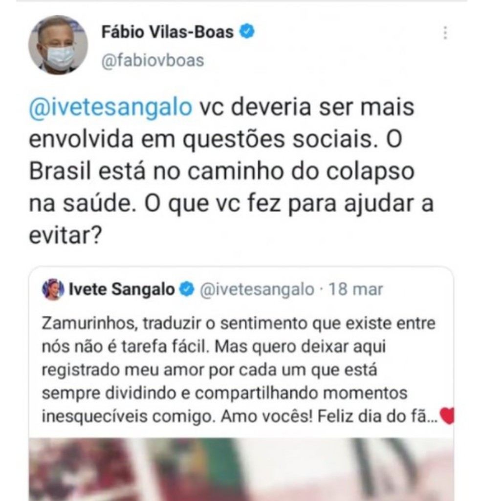 “@ivetesangalo vc deveria ser mais envolvida em questões sociais. O Brasil está no caminho do colapso na saúde. O que vc fez para ajudar a evitar?”, questionou o secretário de Saúde.