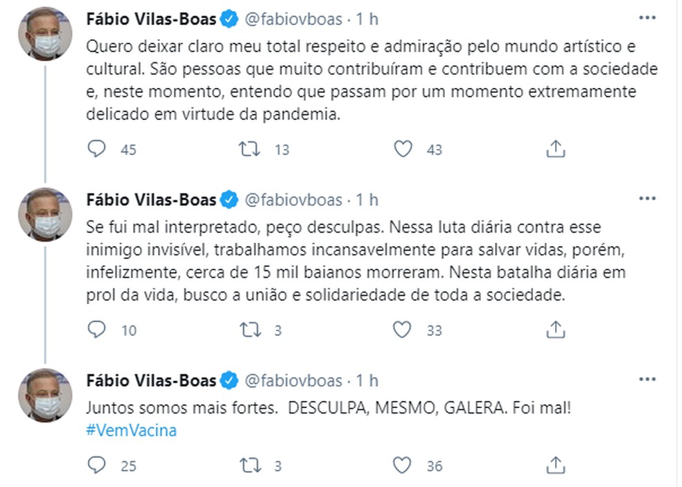 “Se fui mal interpretado, peço desculpas. Nessa luta diária contra esse inimigo invisível, trabalhamos incansavelmente para salvar vidas, porém, infelizmente, cerca de 15 mil baianos morreram. Nesta batalha diária em prol da vida, busco a união e solidariedade de toda a sociedade”.