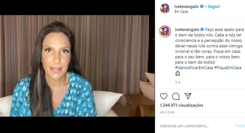 No Instagram, a cantora tem reforçado a recomendação das autoridades de saúde e pedindo para que as pessoas fiquem em casa. Há dez dias, a cantora publicou que aderiu ao isolamento social e que tem procurado fazer tarefas com os filhos, para ocupar o tempo.