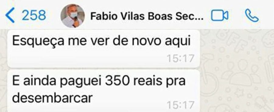 “Esqueça de me ver de novo aqui. E ainda paguei R$ 350 para desembarcar. “Amigo o caralho! Vagabunda”, escreveu ele.