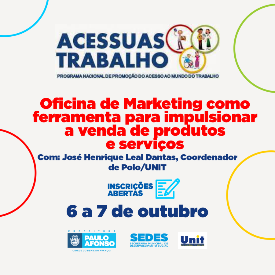 A Secretaria Municipal de Desenvolvimento Social, por meio do Programa Acessuas Trabalho, está com inscrições abertas nesta quarta (6) e quinta (7) para a oficina de Marketing como ferramenta para impulsionar a venda de produtos e serviços. A atividade será ministrada pelo com o Coordenador de Polo / UNIT Paulo Afonso José Henrique Leal Dantas e acontecerá nos dias 14 e 21 de outubro, às 20h pelo aplicativo Google Meet.