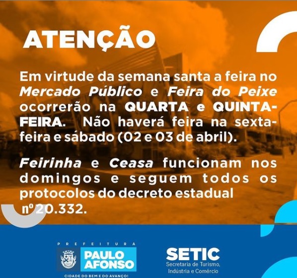 Atenção aos dias de funcionamento das feiras livres nesse período de semana santa em Paulo Afonso: