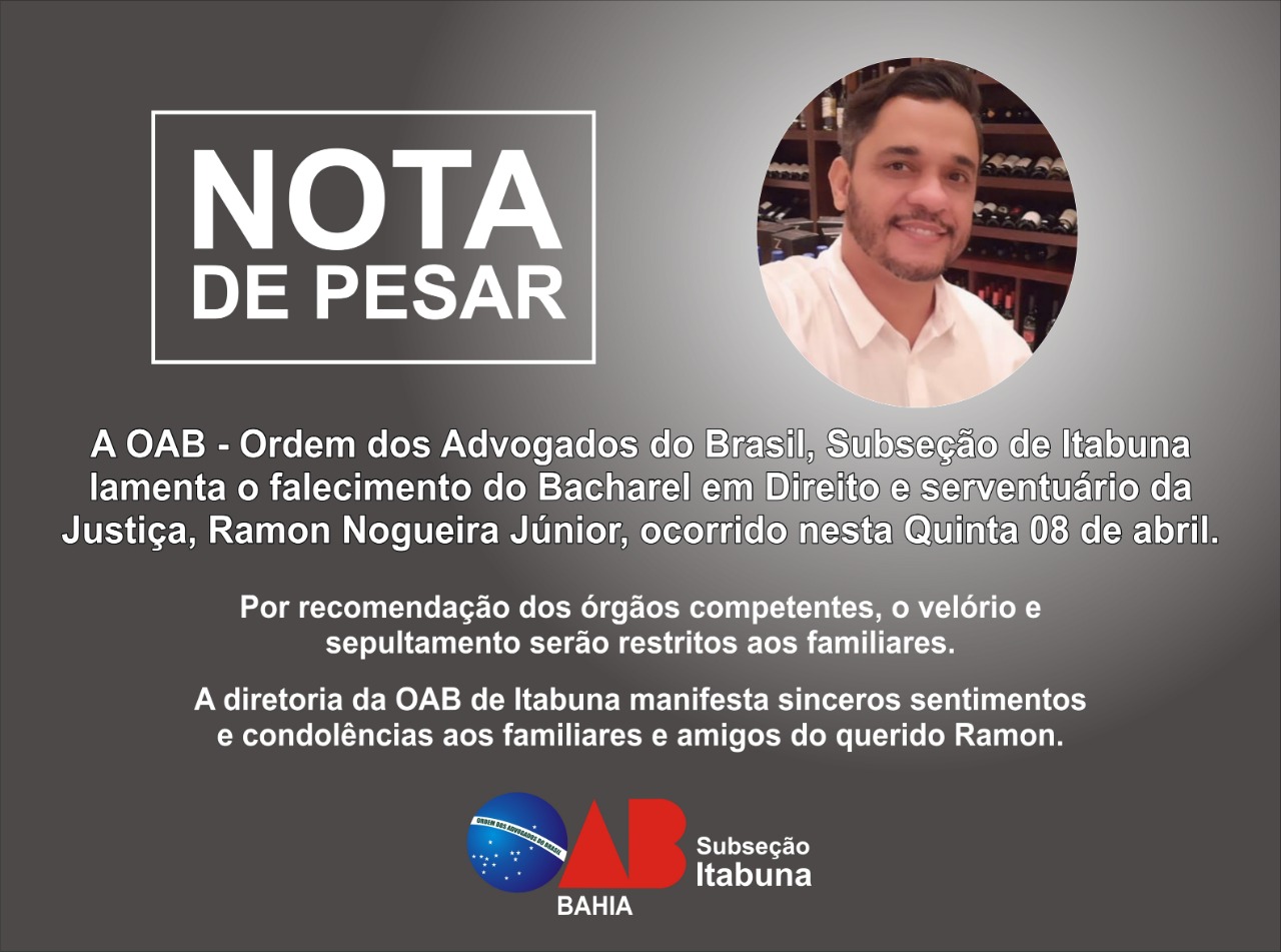 Vítima de Covid-19, morreu nesta quinta-feira, 8, em Itabuna, Ramon Nogueira Jr., aos 38 anos de idade. Bacharel em Direito, ele era serventuário da Justiça – trabalhava no fórum local.