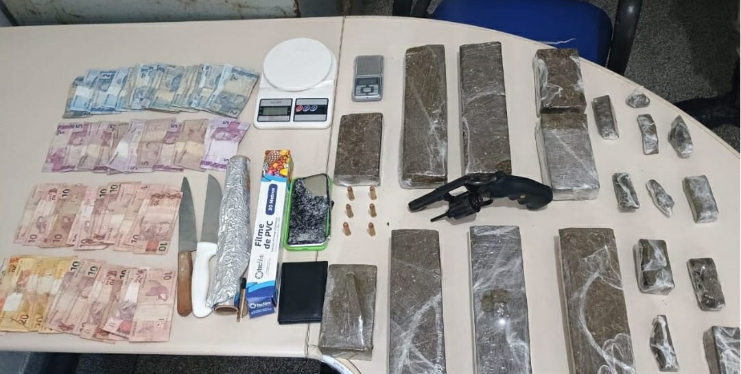 Diante da atitude suspeita, os militares procederam com a abordagem e, antes de ser revistado, o indivíduo arremessou seu aparelho celular contra o chão, danificando-o completamente. Durante a busca pessoal, foram encontrados nove tabletes de substância análoga à maconha, onze porções menores da mesma substância, além de outros materiais ilícitos, como um revólver calibre .38 com seis projéteis intactos, R$ 562,00 em espécie, duas balanças de precisão, rolos de papel alumínio e filme, duas facas do tipo peixeira e dois celulares.