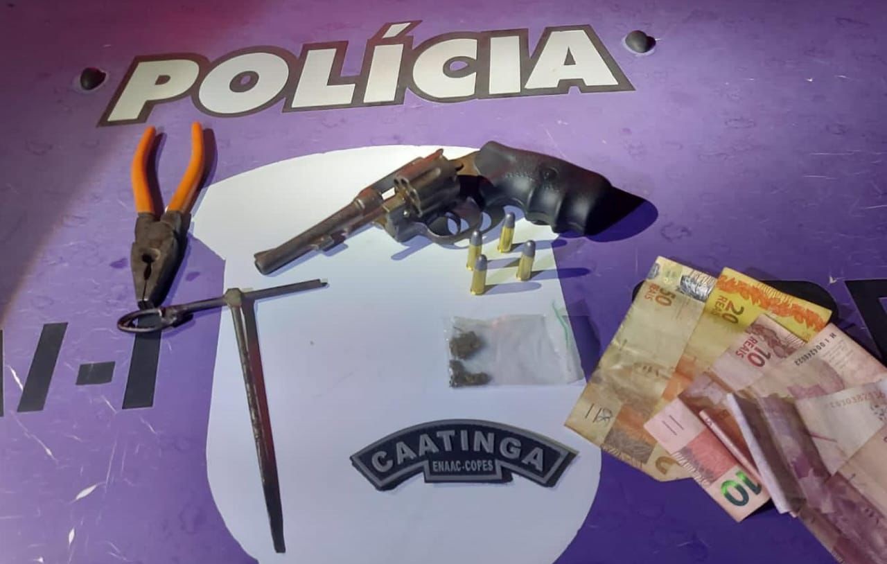 Os policiais chegaram ao local e encontraram os dois indivíduos em questão. Durante a revista, foi encontrado com Bruno Alves da Silva, 22 anos, um revólver calibre 32 contendo quatro munições intactas, além de ferramentas como um alicate e uma chave de fenda codificada, junto com uma quantia de R$ 100,00. O outro suspeito, identificado como Jadinei Niragão Almeida Souza, 41 anos, estava portando uma pedra de crack e um cigarro de maconha.