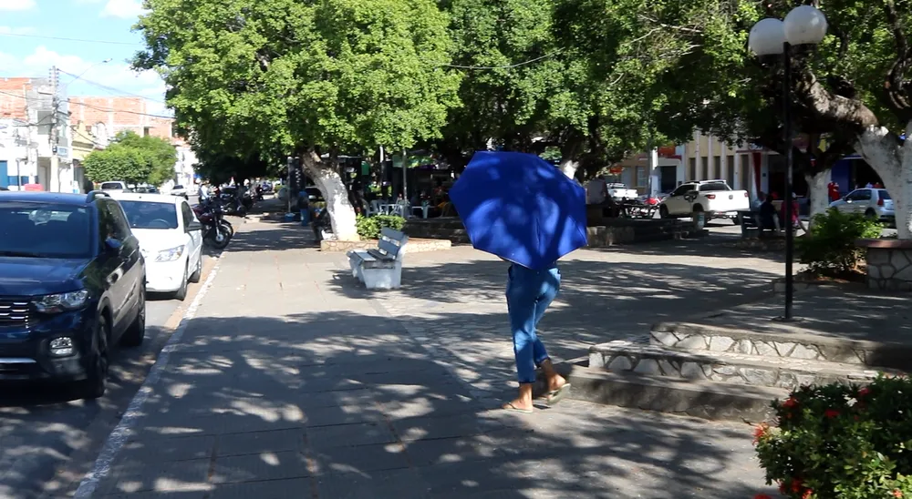 Os moradores tentam amenizar o calor como podem. Nas ruas do centro da cidade é comum ver pessoas usando sombrinhas para se proteger do sol.