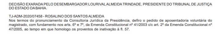 O presidente do Tribunal de Justiça do Estado da Bahia, desembargador Lourival Almeida Trindade, concedeu aposentadoria voluntária ao magistrado Rosalino dos Santos Almeida no cargo de Juiz de Direito de Entrância Final. Ele era titular do 1º Vara Cível da comarca de Paulo Afonso.