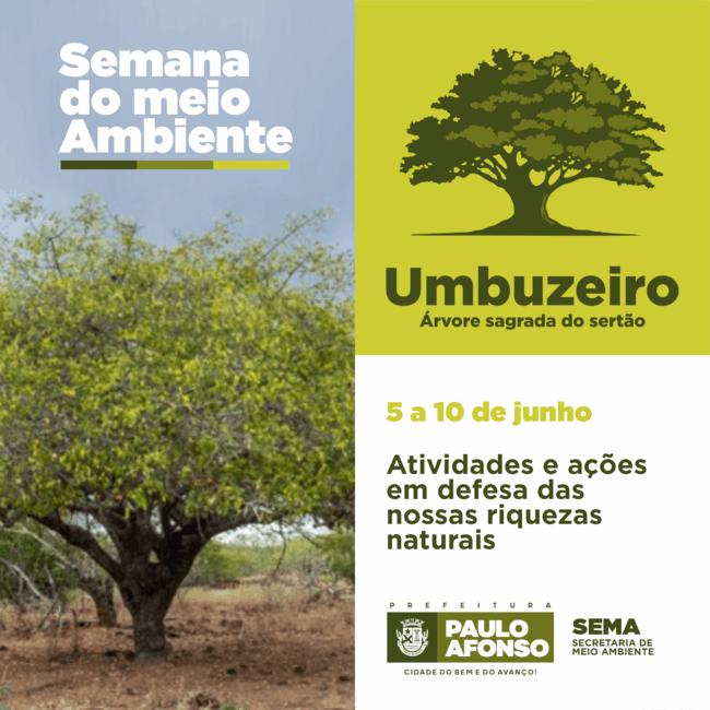 De 5 a 10 de junho a Prefeitura de Paulo Afonso, por meio da Secretaria de Meio Ambiente (Sema), realiza a Semana de Meio Ambiente. Dentre as atividades e ações a serem realizadas, o destaque está para o tombamento do umbuzeiro localizado na Praça do Coreto. A árvore, que está no local há décadas, dá o tema do evento – “Umbuzeiro. Árvore sagrada do Sertão”.