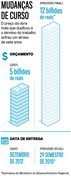 Fora as dificuldades para levar água até onde o projeto prevê, a transposição do São Francisco não foge à regra de todas as grandes obras brasileiras: multiplicação de orçamento, superfaturamento, eternização de prazos, abandono por construtoras e decisões judiciais contrárias à execução. O custo total dos dois eixos da transposição, Norte e Leste, foi estimado em 2007 em cerca de 5 bilhões de reais. Neste ano, o Ministério do Desenvolvimento Regional calcula o valor final em 12 bilhões de reais. Ou seja, mais de duas vezes o orçamento inicial. No relatório mais recente da Controladoria-Geral da União sobre a gestão da obra, o órgão detectou, em apenas um contrato do Eixo Leste, de 841,8 milhões de reais, que a soma de superfaturamento e sobrepreço alcançou 35,7 milhões de reais. O cronograma original do PAC previa a conclusão do Eixo Norte em dezembro de 2012. Em 2016, o Tribunal Regional Federal da 1ª Região (TRF1) chegou a suspender as obras, decisão revertida pelo Superior Tribunal de Justiça (STJ) em abril de 2019. Com 260 quilômetros de extensão, passando por Pernambuco, Paraíba, Ceará e Rio Grande do Norte, o Eixo Norte tem 97% das obras concluídas, segundo o Ministério do Desenvolvimento Regional, que espera começar o transporte de água ainda neste segundo semestre.