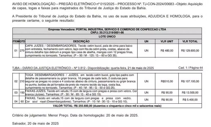 O Tribunal de Justiça da Bahia (TJ-BA) aprovou uma licitação no valor de R$ 255.600,00 para compra de capas, togas e faixas para juízes e desembargadores. O pedido foi assinado pelo chefe do Núcleo de Licitação, Roberto Camacho Garcia, e divulgado nesta quarta-feira (21) por meio do Diário Oficial da Justiça.