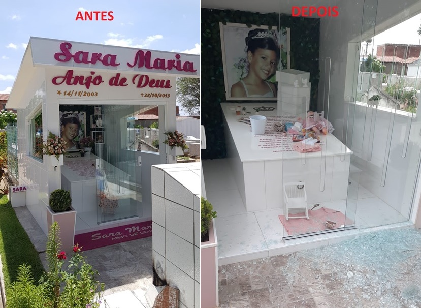 Objetos e memórias afetivas foram furtados na ação criminosa, informou a mãe. “O vidro que protege o túmulo de Sara foi destruído. Um criado mudo na lateral do jazigo foi furtado, um tapete personalizado com o nome de Sara também desapareceu, além de toda decoração do nicho e material de limpeza”, relatou. (Compare as imagens antes e depois)