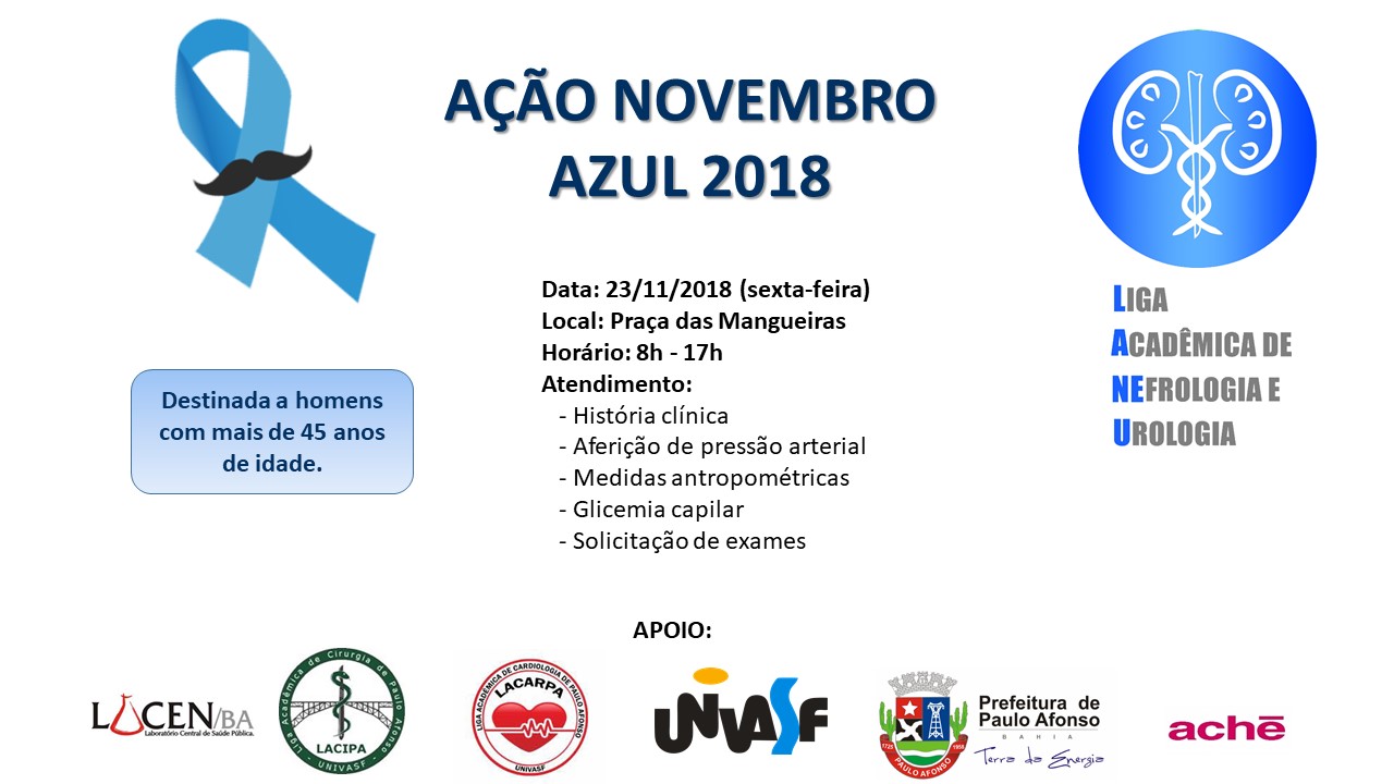 Se você é homem e tem mais de 45 anos de idade não perca essa chance de cuidar de sua saúde. Isso porque, em comemoração ao mês de Novembro, a Universidade Federal do Vale do São Francisco (UNIVASF) vai desenvolver no dia 23/11/2018 a segunda edição do NOVEMBRO AZUL na cidade de Paulo Afonso/BA.