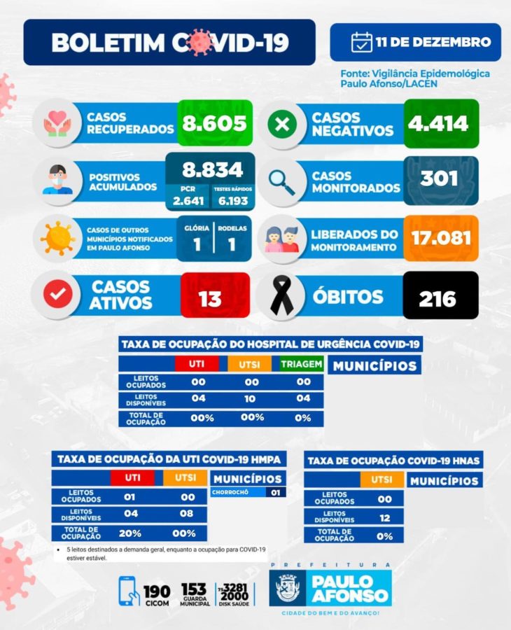 O Boletim Epidemiológico deste sábado (11) registra apenas uma pessoa internada no município com o novo coronavírus, mas ela é da cidade de Chorrochó (BA) e está em tratamento na UTI do Hospital Municipal de Paulo Afonso (HMPA).